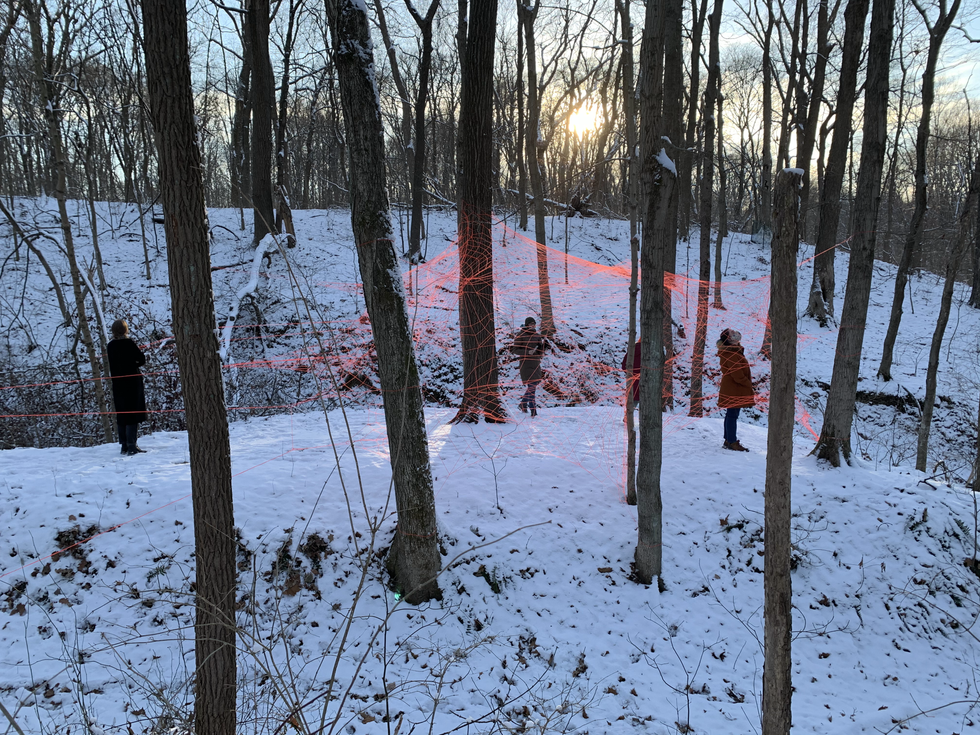 OrangeGrove was installed on a wooded trail on the edge of the Southern Illinois University of Edwardsville nature preserve. Constructed in Fall 2020, It was made using a process of knotless netting similar to dream-catcher weaving, spiderweb patchwork and crystalline growth. The structure was removed after 1 year.